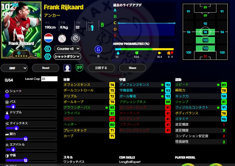 ただしフィジカル63とかなり低く、ドリブル操作が苦手な父さん的には、相手DFにぶつかるとすぐボールを奪われそうでちょっと不安……。
